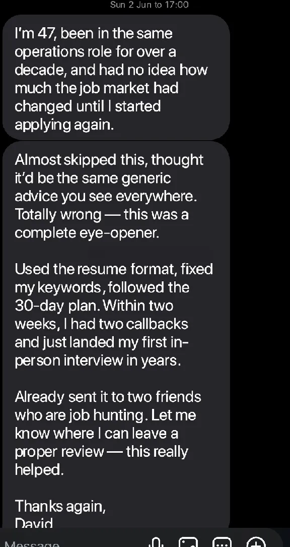 “I hadn’t job hunted in 7 years and had no idea how much had changed. My resume was getting ghosted everywhere. This book gave me a full reset—what to say, how to format, even how to follow up. I feel like I finally understand how hiring works now… and I’m back in control.”